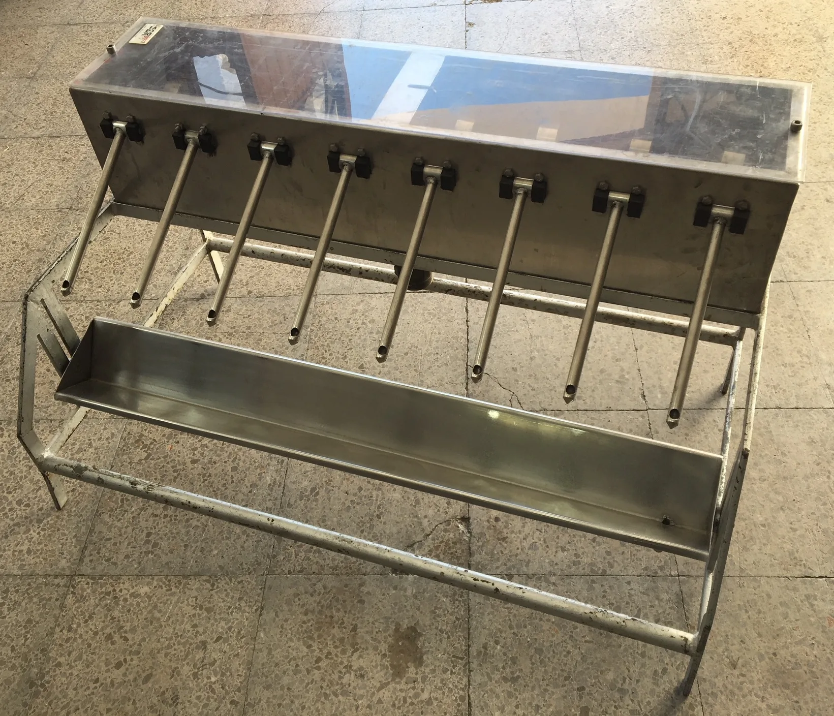 La llenadora incorpora un deposito de acomulación en la parte superior, donde por levantamiento de levas con unas boias se puede dosificar la cantidad adequada.