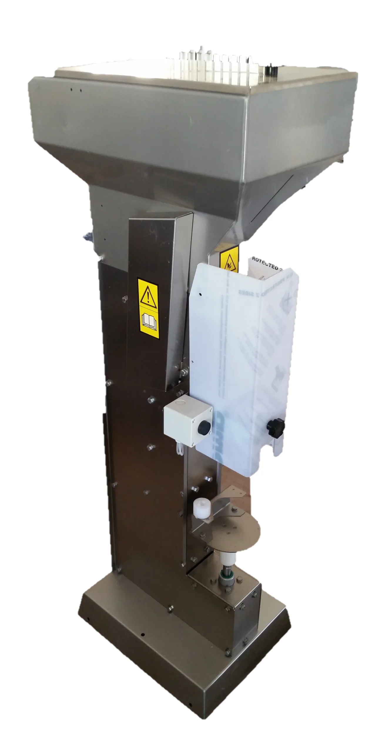 La máquina está equipada con una tolva de carga automática de acero inoxidable. Taponadora neumática, Presión mínima 6 bar.